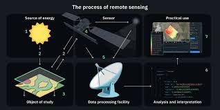 Remote sensing involves collecting data about a surface (usually Earth or other planets) without direct contact. Sensors detect radiation reflected or emitted from the surface in various electromagnetic bands (visible, infrared, microwave), and these signals are then converted into usable data formats.